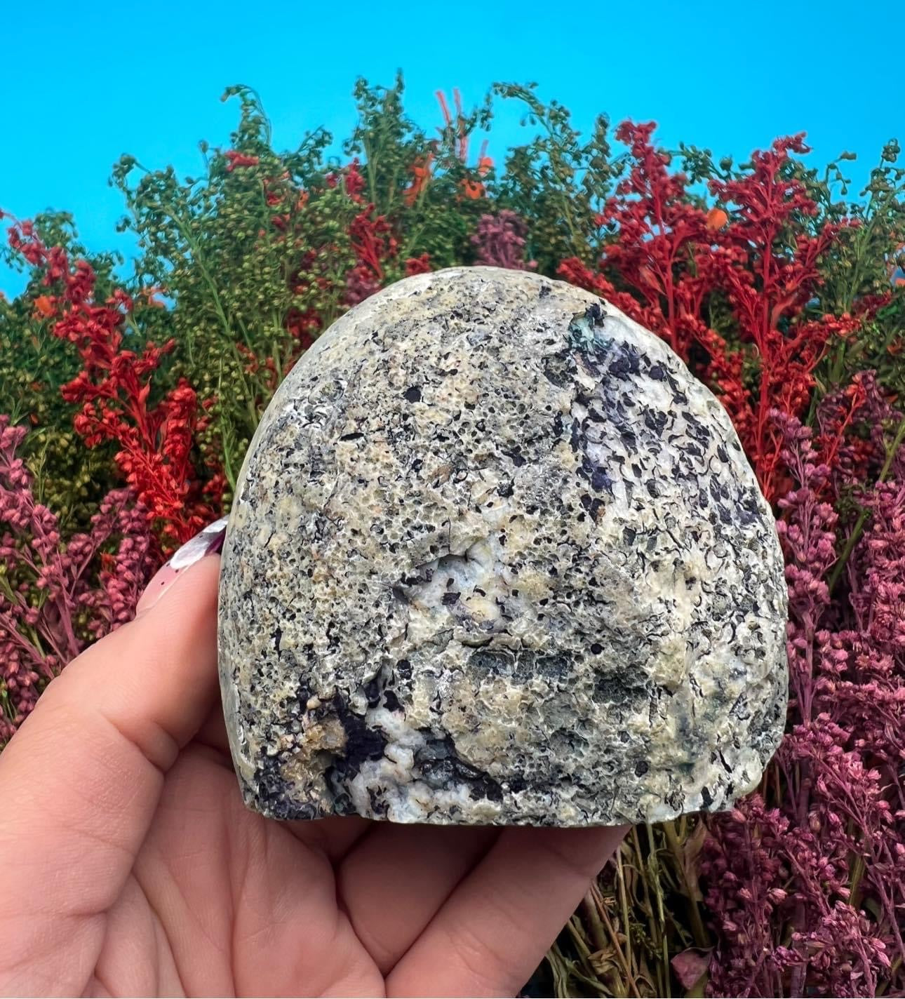 This listing is for one 2.75” Blue Dyed Agate Druzy Geode Freeform. Front and back shown. Stands upright for display.
