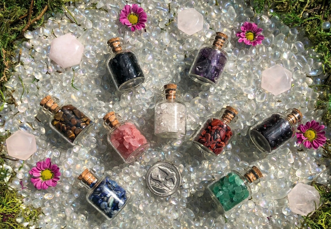 This listing is for one 1.25” Mixed Crystal Chip Bottle (9pc) Set.